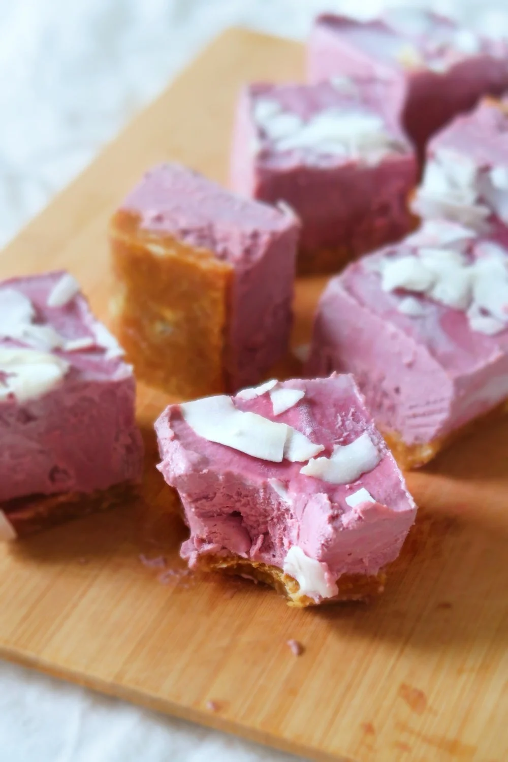 Blend until smooth, pour the mixture onto the base, add some toppings (we used coconut flakes) & place in the freezer overnight (or at least for 3-4 hours).