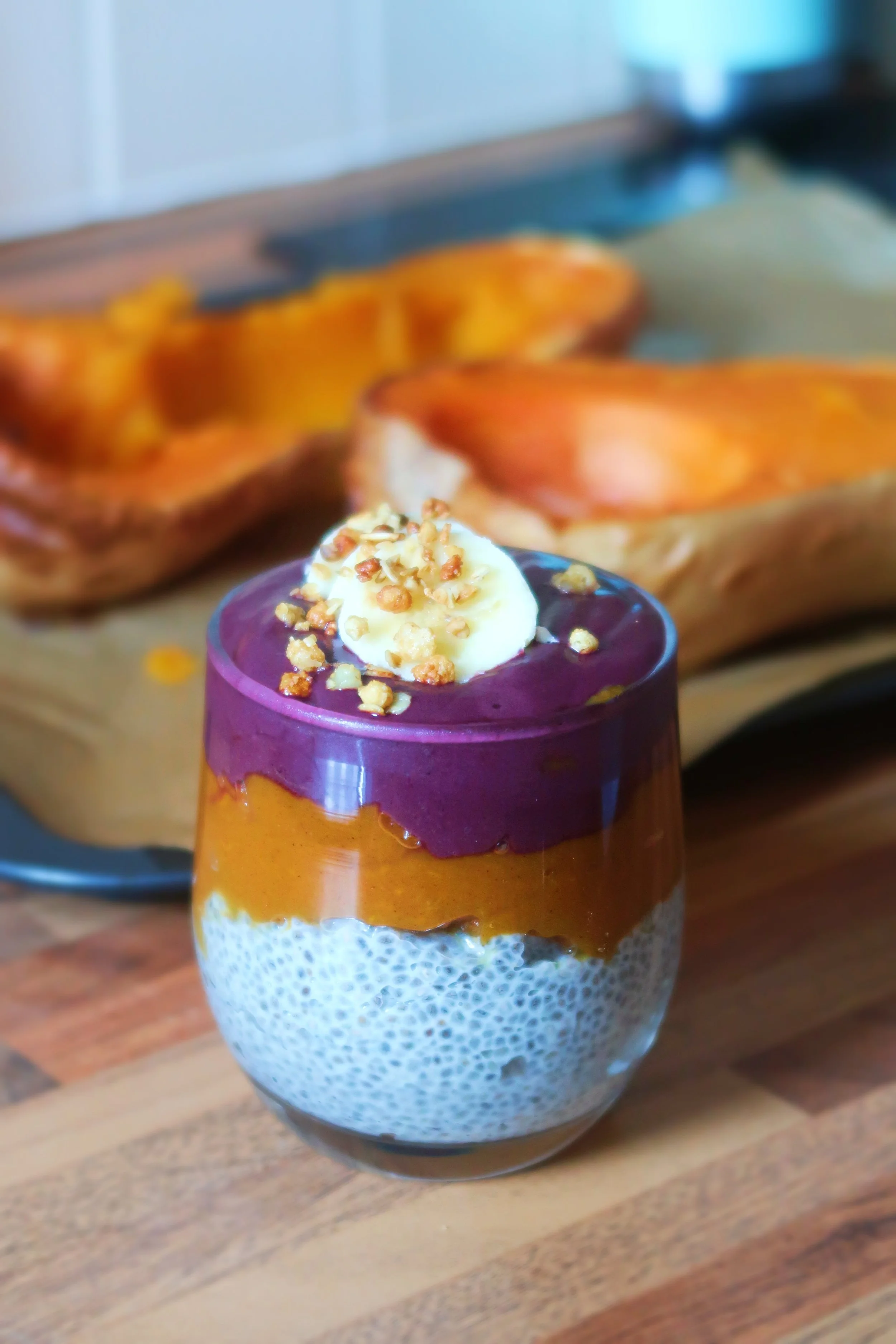 Place all of the layers in a glass/jar starting with the chia pudding at the bottom, then the pumpkin layer and the açaí layer as the last one.